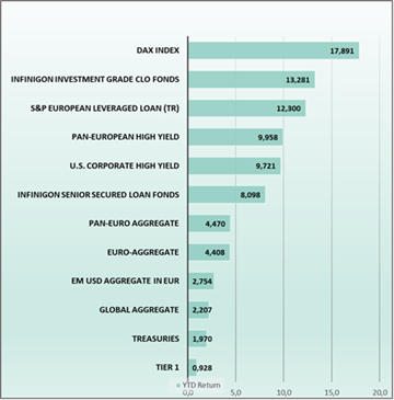 Ein treibender Faktor ist die variable Verzinsung eines CLO-Investments, welches seit der Zinswende durch die Fixierung an den 3-Monats-Euribor eine sehr profitable Komponente hat. Zusätzlich konnte sich der Investor je nach eigenem Risikoprofil attraktive Kreditspreads sichern, welche deutlich über denen von Unternehmensanleihen gleichen Ratings liegen. Selbst das Segment High Yield Corporate Bonds wurde geschlagen, bei deutlich größerer Diversifikation.