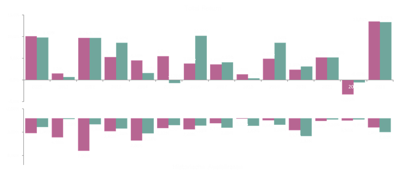Im folgenden Diagramm** wird die Jahresperformance der Anlageklasse mit der entsprechenden Ausfallrate gegenübergestellt. Deutlich wird, dass mögliche Verluste mehr als überkompensiert werden. Es ist wichtig zu bedenken, dass die durchschnittliche historische Recovery Rate bei 60% liegt, was die tatsächlichen Verluste noch weiter minimiert.