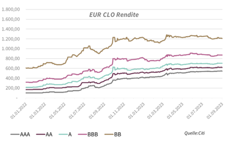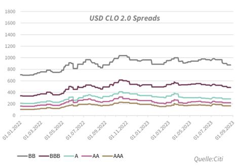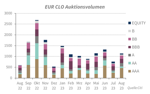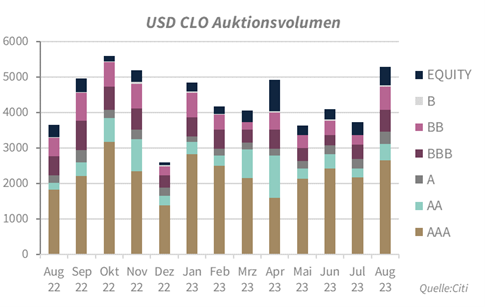 Auch auf der Primary-Seite waren die CLO-Märkte im August aktiv. In Europa haben im Sommer 11 CLO Neu-Emissionen gepreist. Im August wurden weitere 0,8 MM Euro an Neuemissionen gebracht, damit stieg das Volumen der europäischen CLO-Neuemissionen YTD auf ca. 15,8 Mrd. Die USA-Neuemissionen stiegen mit weiteren 10 Mrd. USD auf insgesamt 167 CLO-Deals mit ca. 72 Mrd. USD YTD.