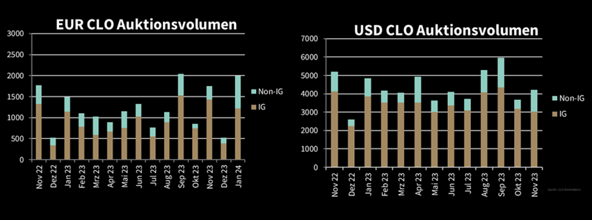 Für das Jahr 2024 wird eine Zunahme an Refinanzierungen erwartet. Die prognostizierten Neuemissionsvolumina für 2024 sind vergleichbar mit dem Vorjahr, wobei bis zu 30 Milliarden Euro an CLO-Neuemissionen in Europa und bis zu 120 Milliarden US-Dollar in den USA erwartet werden.