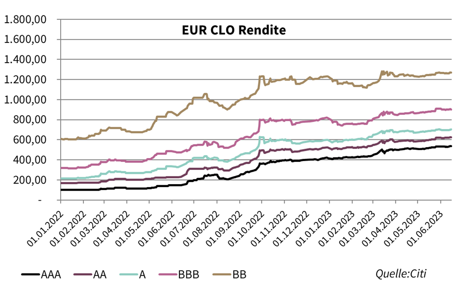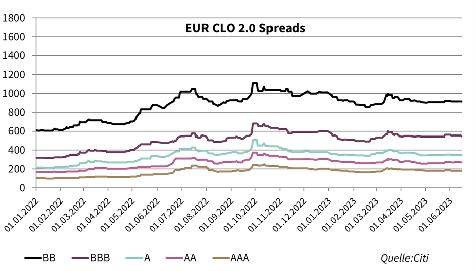 Es fanden wie in den letzten Monaten lediglich vereinzelte Neuemissionen statt. Die CLO-Emittenten warten nach wie vor auf die günstigeren Konditionen. Allerdings waren diese Emissionen von der stetigen Nachfrage unterstützt. Insbesondere die Nachfrage von japanischen Investoren nach für die Platzierung am meisten relevanten AAA-Tranchen bleibt stabil.
