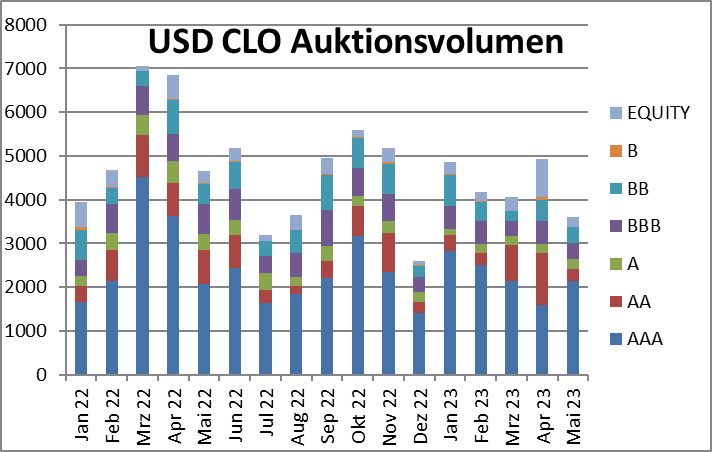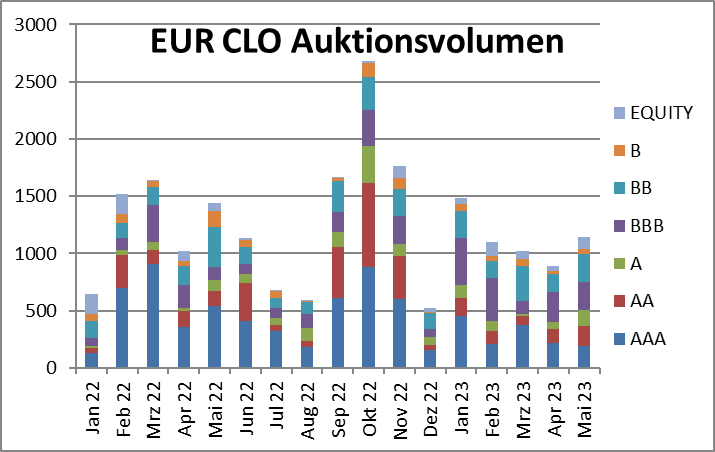 Es wurden in Europa 6 neue Transaktionen mit ca. 2,5 Mrd. EUR platziert, womit das Volumen der europäischen CLO-Neuemissionen YTD auf ca. 10,3 Mrd. stieg. Die USA-Neuemissionen stiegen mit weiteren 10,9 Mrd. USD in 26 Transaktionen auf 47,2 Mrd. Auch wenn der Vergleich mit dem Vorjahr eine signifikante Reduktion des Neuemissionsvolumens zeigt, sind für das Jahr 2023 noch große Volumina an CLOs geplant. In den USA erwartet man ca. 70 Mrd. an weiteren Neuemissionen, in Europa ca. 11,5 Mrd. Sollen allen geplanten CLOs in 2023 tatsächlich kommen, so liegt das Gesamtvolumen des Neugeschäfts auf dem Durchschnittsniveau der letzten fünf Jahre.