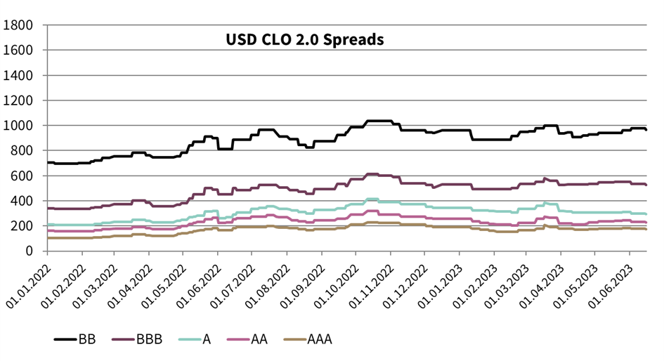 Im Mai beobachteten wir eine klare Divergenz zwischen dem US- und europäischen Markt. Die Schuldengrenzkrise und die damit verbundene Unsicherheit führte in den USA zu einer vorübergehenden Ausweitung der CLO-Spreads. Die Spreads in Europa blieben stabil.